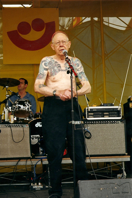 With a lifetime of experience as a musician and carpenter, he always had a story to tell. His amazingly colorful tattoos (which can be seen on the covers of TDA records Squeeze This! and No Strings Attached) always caught the audience's eye. But it was Clyde's limitless charm and infectious personality that hooked 'em forever.